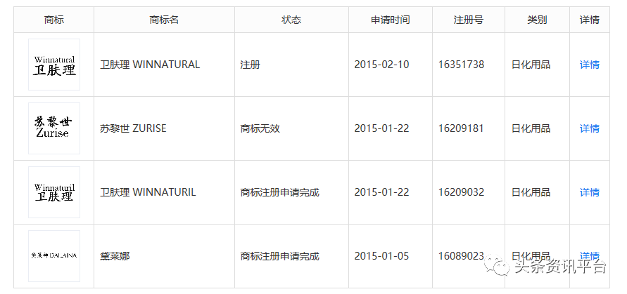 据官方介绍,江西硕美生物科技有限公司的研发团队曾服务于法国欧莱雅集团,现已形成集护肤品研发、生产、微营销为一体的高科技公司。卫肤理名下的产品包括亮肤修复面膜、祛痘精华霜、植萃焕颜精华霜和植萃焕肤精华液等。现旗下拥有“Winnatural—卫肤理”、“Zurise—苏黎世”、“Dailaina—黛萊娜”等多个化妆品品牌,调查发现,这些商标的注册类别都是日化用品,其中“苏黎世ZURISE”的商标甚至还是无效的状态。
