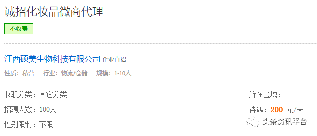 卫肤理招募微商代理的方式也十分简单粗暴,无非就是在58同城等网站上,发布“高薪急聘化妆品网络销售”、“诚招化妆品微商代理”、“网络推广专员”等消息。