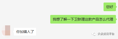 与此同时,在我们添加了另外一个当时该公司的某位联系人的微信账号,并表达了想要咨询卫肤理产品怎么代理的来意后,却在对方说了一句“你加错人了”后即被拉黑。