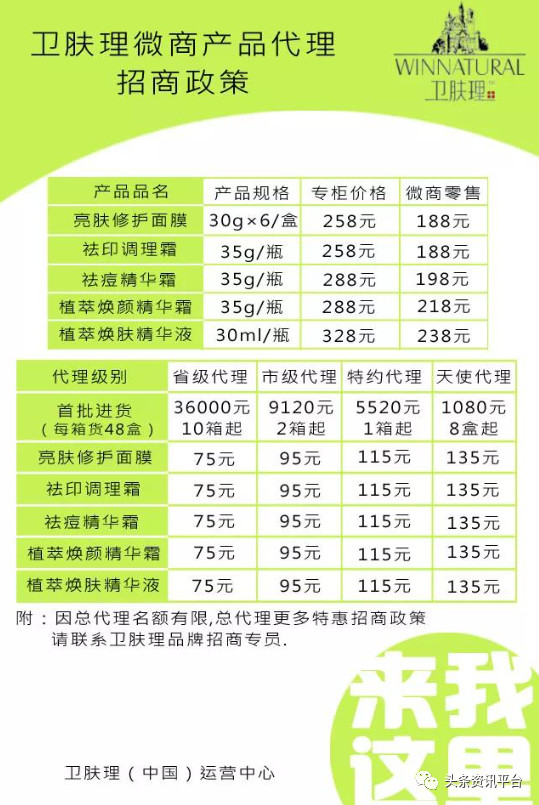 据了解,起初,卫肤理品牌分销代理制度模式为在全国划分若干大区,以形成区域总代理-分区总代理-省级代理-市级代理-特约代理-天使代理的制度。