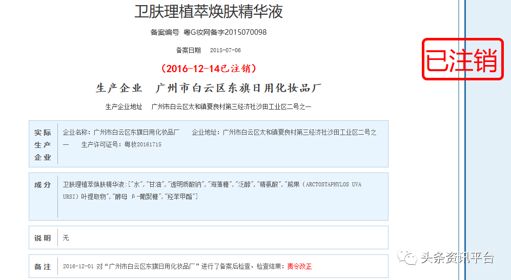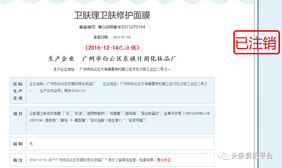 至于其产品,通过国产非特殊用途化妆品备案平台进行查询后,我们发现涉及到的两款产品“卫肤理卫肤修护面膜”和“卫肤理植萃焕肤精华液”(生产企业都是广州市白云区东旗日用化妆品厂,这里并未看到江西硕美的相关信息,可见其产品连代加工都算不上)都曾在2016年12月1日被责令改正,当月14日,两款产品同时注销。