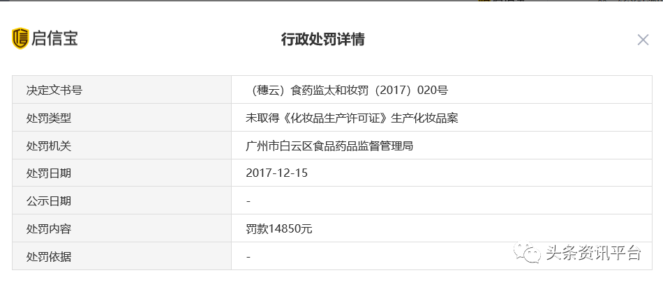 时间来到了2017年,生产这两款产品的广州市白云区东旗日用化妆品厂因“未取得《化妆品生产许可证》生产化妆品案”遭到了广州市白云区食品药品监督管理局罚款14850元的行政处罚。