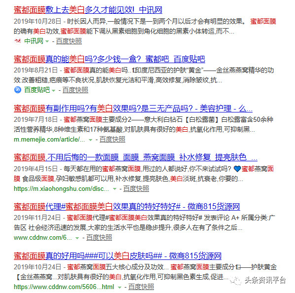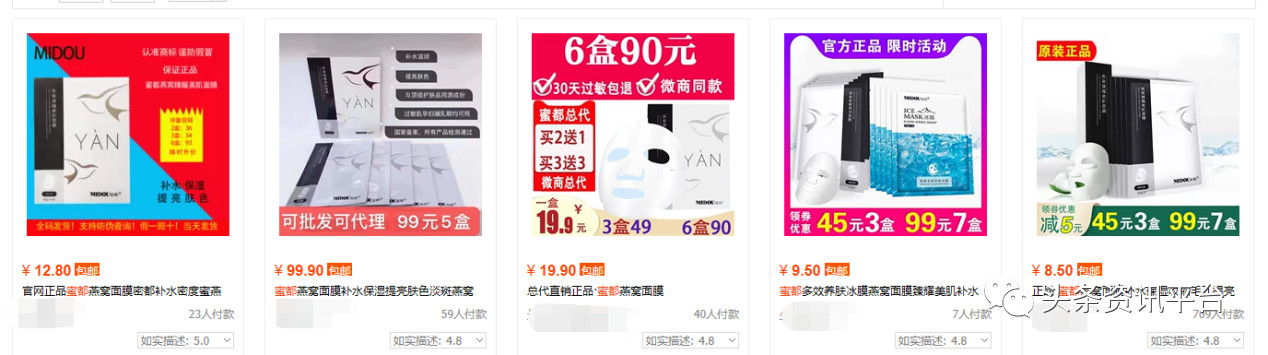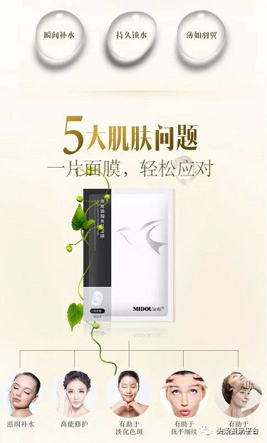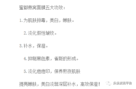 但相应地,蜜都代理们的声音则是“百无禁忌”,代理小李声称,蜜都燕窝面膜共有五大功效: