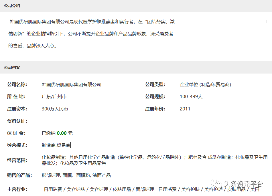 经查,北京梦带你飞文化传播有限公司的法定代表人为孟令卫,公司股东有上文提到过的陈志昊。另外,我们还发现韩国优研肌国际集团有限公司是一家在香港注册的私人股份有限公司,公司成立时间在2015年。根据百度搜索该公司时弹出的首个网站显示,该公司的所在地是广东省广州市。