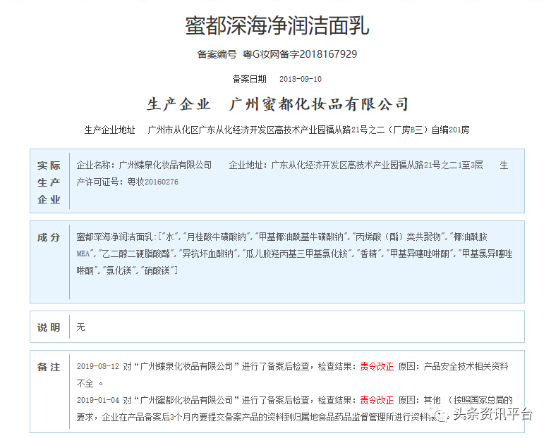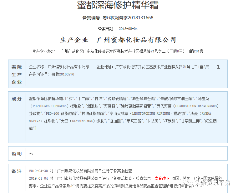 经查国产非特殊用途化妆品备案平台,我们发现该产品和“蜜都深海透亮肌能水”、“蜜都深海焕活新生乳”等产品在今年都曾两度被“责令改正”,原因皆分别是“按照国家总局的要求,企业在产品备案后3个月内要提交备案产品的资料到归属地食品药品监督管理所进行资料报备”以及“产品安全技术相关资料不全 ”。