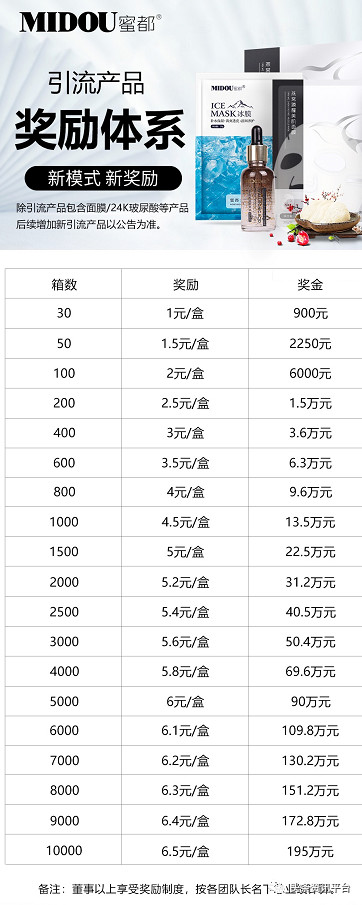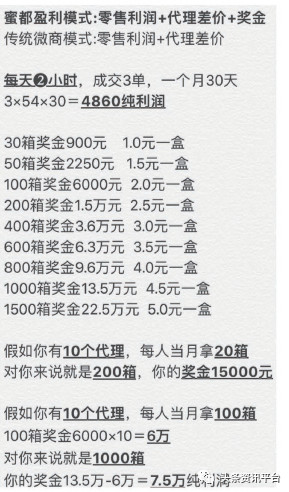 据《蜜都商业计划书豪华版》介绍,当代理达到了董事的级别之后,除了卖货赚差价之外,还有高额的业绩奖励,一个月完成30箱奖励900元,一个月完成50箱奖励2250元,一个月完成100箱奖励6000元。