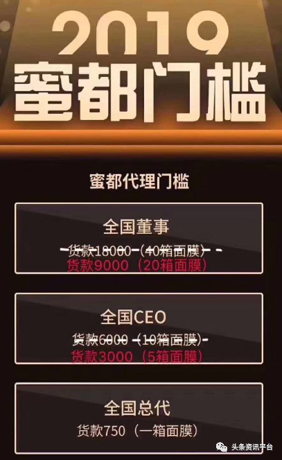 我们以零售价为59元/盒(一盒有5片面膜)的燕窝面膜为例。第一个级别就是所谓的“0箱0门槛”,也可以称为“团购”,他的利润来源为卖一组(99元/3盒)时,可以得到15元的提成;再高一级的CEO的入门门槛为1980元,也就说要买3箱(一箱30盒,共计90盒),单箱价为660元,面膜的单价为22元一盒;买20箱(600盒)的话,单箱价为450元,总金额为9000元,此时面膜产品的拿货单价对于这位董事来说,就只有15元了。
