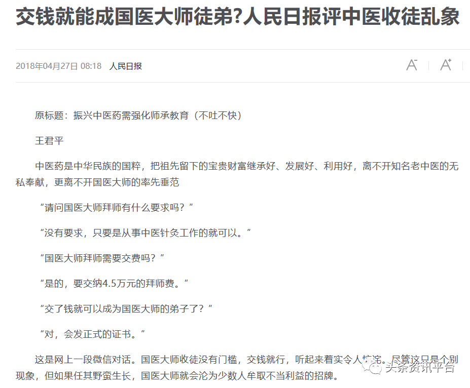 早在2018年,“国医大师收徒没有门槛,交钱就行,听起来着实令人惊诧。尽管这只是个别现象,但如果任其野蛮生长,国医大师就会沦为少数人牟取不当利益的招牌”的现象,就已成了《人民日报》刊登的评论文章《振兴中医药需强化师承教育》所批评的对象。