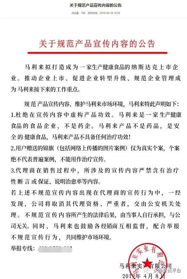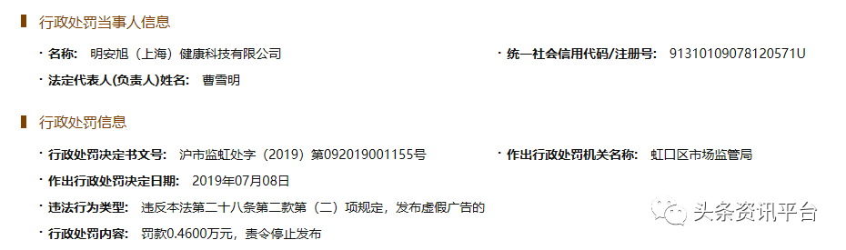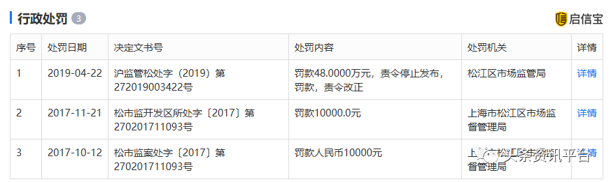 而该公司的母公司马利来实业有限公司在最近几年也多次遭受过行政处罚。2017年10月,马利来实业有限公司因虚假宣传案遭到了上海市松江区市场监督管理局的罚款;2019年4月,该公司因发布虚假广告,遭到了松江区市场监管局“罚款48万元,责令停止发布”等处罚。