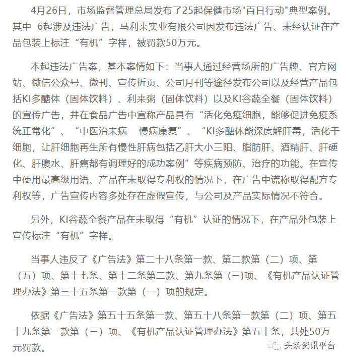 其中,“上海查处上海马利来实业有限公司发布违法广告案”,还上了国家市场 监管总局在2019年11月末召开的新闻发布会上,所发布十起食品安全违法犯罪典型案例。