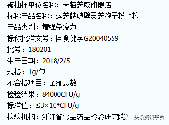 2018年11月27日,国家市场监督管理总局发布《关于23批次食品不合格情况的通告》(2018年第43号),共有23批次不合格食品被检出,其中天猫芝威旗舰店(经营者为上海运芝食用菌有限公司)在天猫网上销售的标称上海埃克生物制品有限公司委托上海运芝食用菌有限公司生产的运芝牌破壁灵芝孢子粉颗粒,菌落总数不符合食品安全国家标准规定。