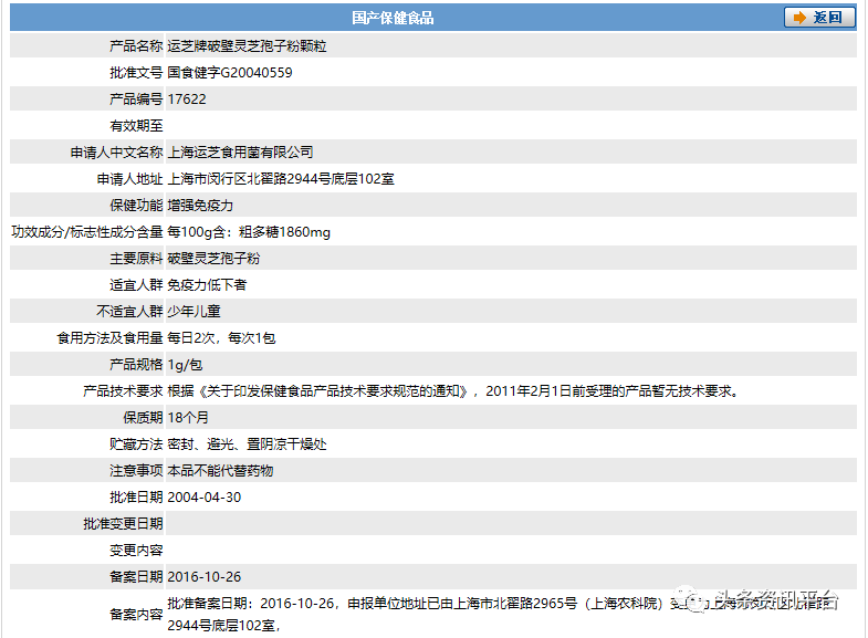 经查国家食品药品监督管理局官网,我们发现上海运芝食用菌有限公司为该款产品的申请人,顺带一提,在“产品技术要求”这一栏里写的是“根据《关于印发保健食品产品技术要求规范的通知》,2011年2月1日前受理的产品暂无技术要求。”