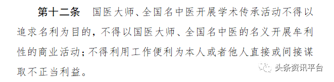 而在此两个月前,国家中医药管理局就曾专门出台了《国医大师、全国名中医学术传承管理暂行办法》,明确要求任何机构、社会组织或个人不得利用国医大师、全国名中医荣誉称号进行不当炒作或进行不当商业牟利等。