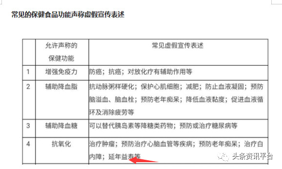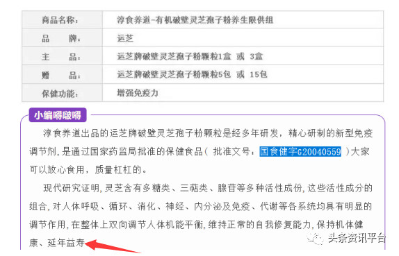 在该篇宣传文章中,我们看到了此产品具有“延年益寿”等功效,而事实上,这四个字属于“常见的保健食品功能声称虚假宣传表述”。