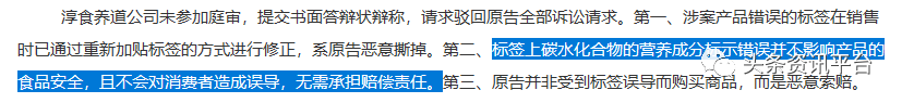在答辩的过程中,淳食养道公司提出的一个论点颇为值得关注:“标签上碳水化合物的营养成分标示错误并不影响产品的食品安全,且不会对消费者造成误导,无需承担赔偿责任”。