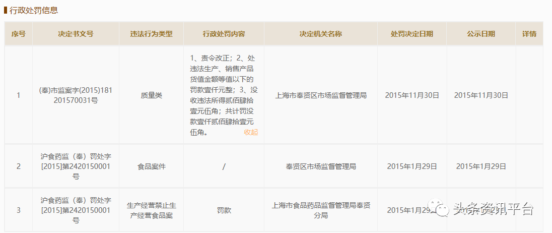 调查发现,上海埃克生物制品有限公司在2015年1月29日因生产禁止生产经营食 品案遭到了上海市奉贤区市场监督管理局的行政处罚;同年11月30日,该公司又因“质量类”问题遭到了上海市奉贤区市场监督管理局的责令改正与罚款等处罚。