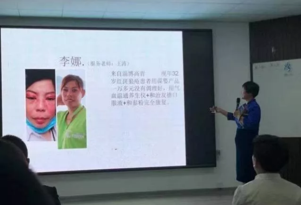 插图1:邢见见会议现场分享治病成功案例及产品功效