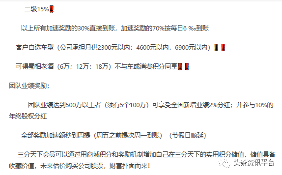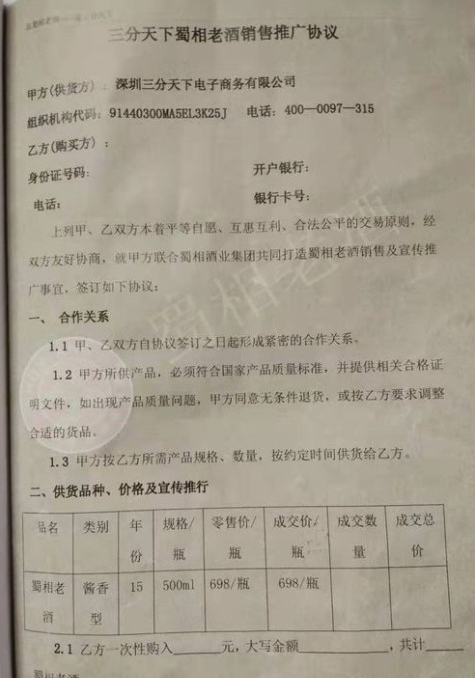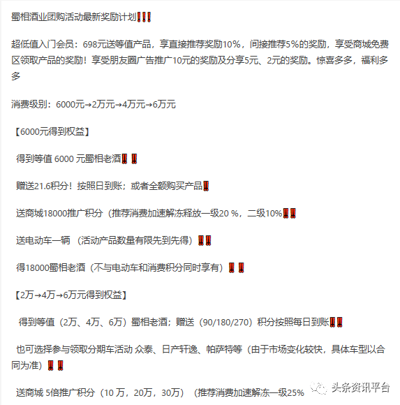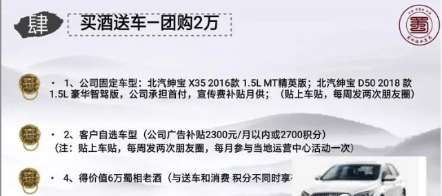 说到运营中心,这里多提一句,运营中心指的是投资二十万元,公司给二十万元的蜀相老酒,另送十万元的品鉴酒,还送每天600元补助费的参与者。当然,运营中心需要履行的义务同样也包括赠送的汽车车身需要张贴“蜀相老酒”宣传车贴,与公司签订法律合同,且需要贴3年等。