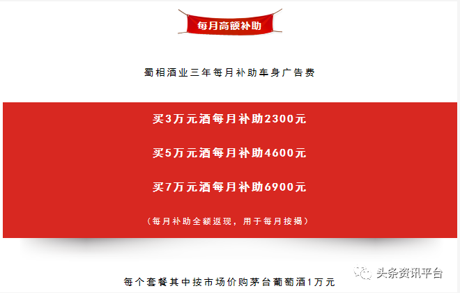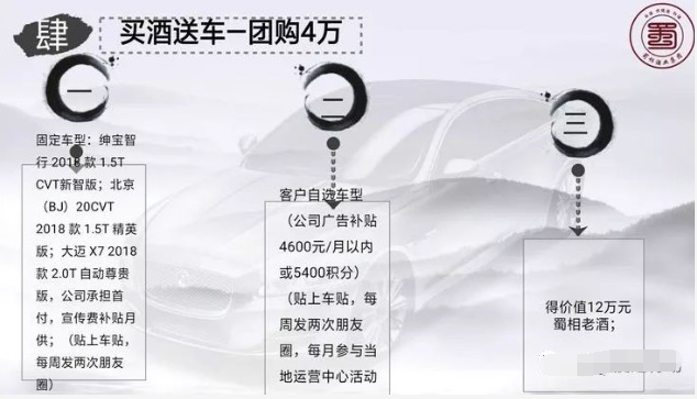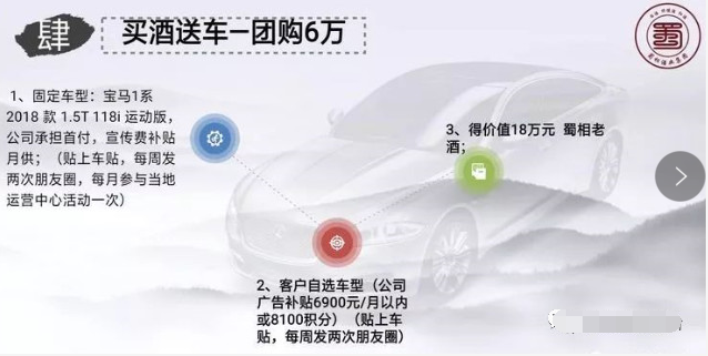 在享受上述优惠的情况下,参与活动者也需要完成以下3个任务:第一,每周不低于两次发蜀相老酒指定内容的朋友圈;第二,需要贴蜀相老酒的车体广告,贴3年;第三,每月去当地运营中心参加一次蜀相老酒的学习品鉴会。