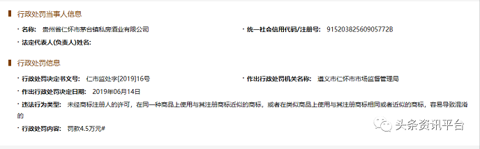 经查,贵州省仁怀市茅台镇私房酒业有限公司在今年6月14日刚刚因“未经商标注册人的许可,在同一种商品上使用与其注册商标近似的商标,或者在类似商品上使用与其注册商标相同或者近似的商标,容易导致混淆”的行为,遭到了遵义市仁怀市市场监督管理局的4.5万元的罚款。