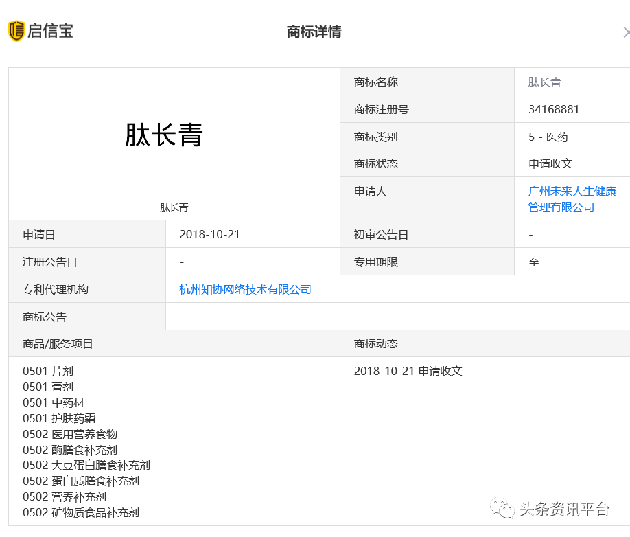 这家公司在去年申请了范围在日化用品和医药板块的商标“肽长青”,但据启信宝显示,这两款商标的注册状态在目前还依然处在“申请收文”的阶段。