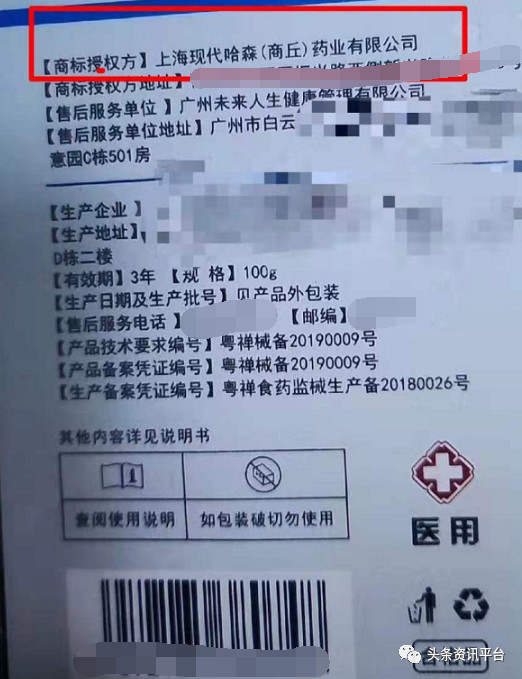 据相关微信群里流出的最新图片显示,该产品的商标授权方为上海现代哈森(商丘)药业有限公司。