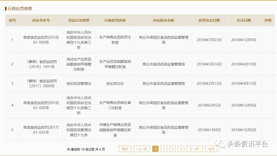 据国家企业信用信息公示系统显示,2014到2018年间,哈森药业每年都遭到了行政处罚,且处罚多与生产销售劣药相关。