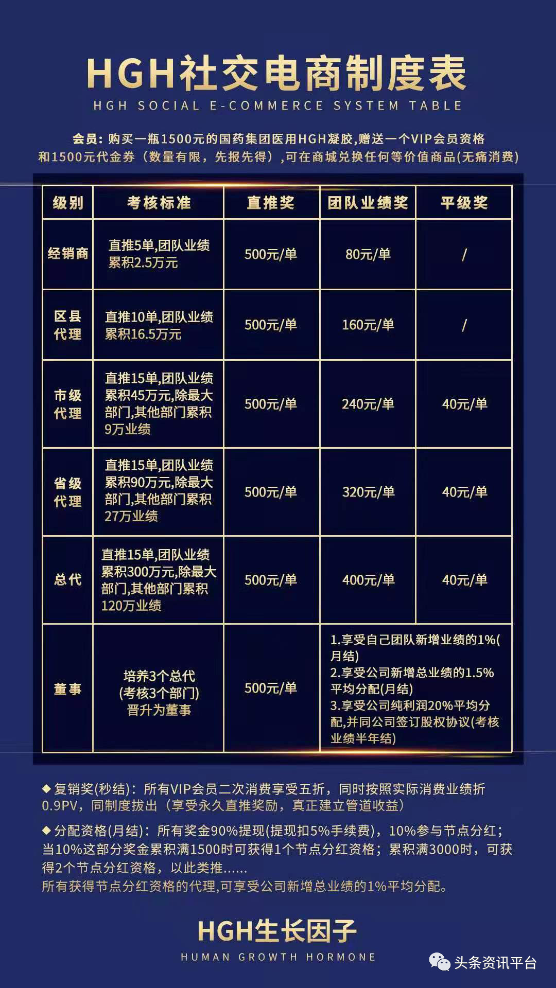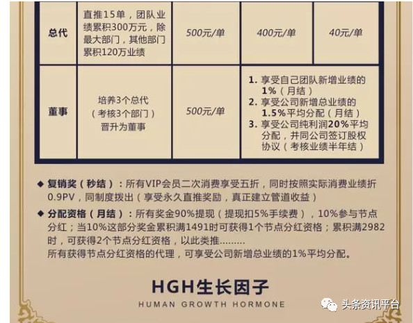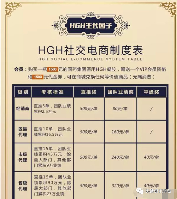 据“国药集团HGH社交电商制度”显示,参与这项目的代理共分为6个级别,分别是经销商、区代、市代、省代、总代和董事。