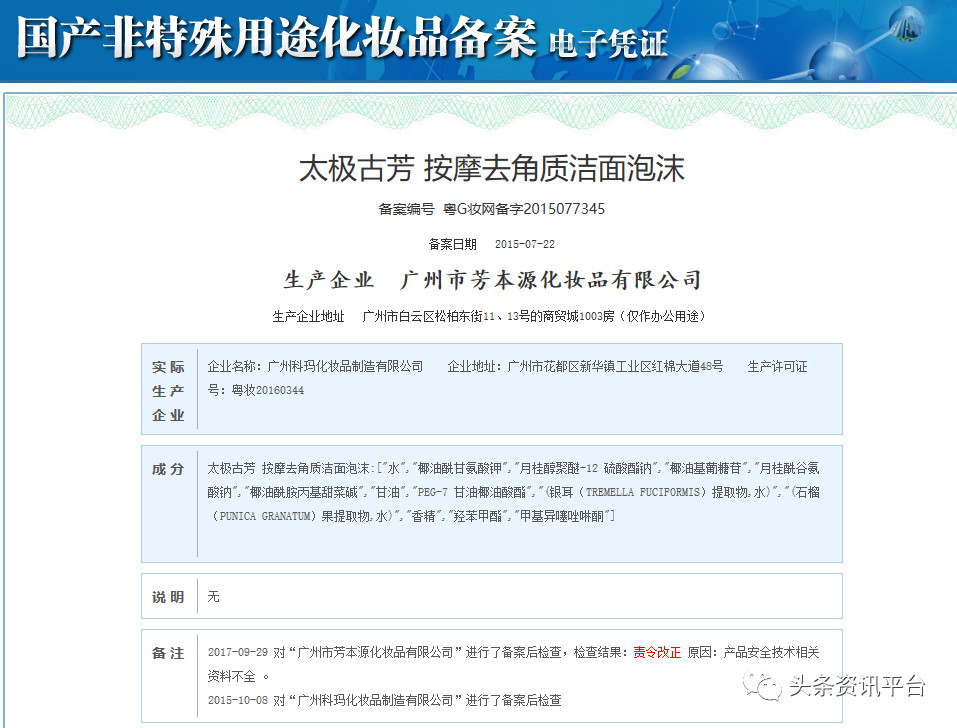 除了参王微动力外,太极古芳名下还有多款其他产品。经查国产非特殊用途化妆品备案平台,我们发现多款冠以“太极古芳”之名的产品,都曾被“责令改正”过,比如“角质层修护补水面膜”、“毛孔细致原液”、“蜗牛弹润肌底原液”、“火山岩泥黑头导出液”、“肌底修护沁润精华油”、“氨基酸肌底净澈洁面乳”、“舒缓亮柔眼胶”、“醒目敷眼液”、“玻尿酸保湿精华水”、“爱上精油水光液”、“按摩去角质洁面泡沫”、“刷刷洁面泡沫”等等,这里就不一一列举了。调查发现,这些产品被责令改正的原因多为“产品安全技术相关资料不全”和“企业未按期配合备案后监督检查工作”。