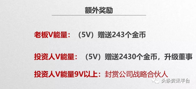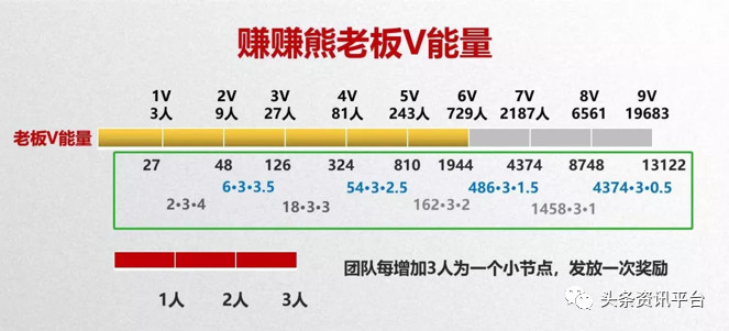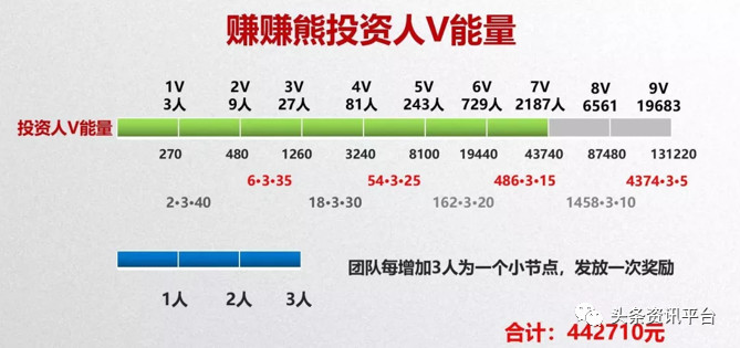 第五,团队每增加3个人,平台发放一次奖励,团队人数增加,V值就增加,奖励也随之增加,最终达到9V就可得44271元;