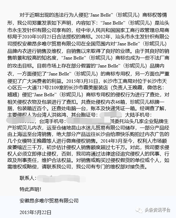 该《声明》显示,“Jane Belle”(珍妮贝儿)是汕头市永生发针织有限公司享有的合法授权的商标。2012年,汕头市永生发针织有限公司授权安徽昂多唯尔贸易有限公司在全国范围内对“Jane Belle”品牌内衣进行销售及维权。