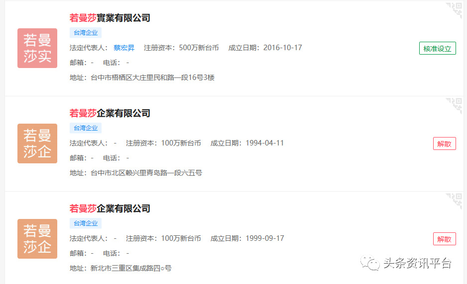 第一家,名为若曼莎企业有限公司,1994年4月成立,1999年8月解散;第二家公司与该公司同名,1999年8月成立,2003年春解散;第三家企业,名曰若曼莎实业有限公司,代表人是蔡宏昇(前两家公司都没有代表人姓名),成立于2016年10月,而这个蔡宏昇就是一些宣传材料所说的“若曼莎总经理”。