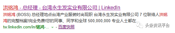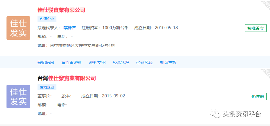 顺带一提,在上述图片中的“永生发实业有限公司”成立于2013年4月,代表人和佳仕发实业有限公司的代表人是同一个,还是蔡株容,洪铭鸿则是台湾永生发实业有限公司的总经理,而为什么要提这个姓洪的人,我们会在下文中有所介绍。另外,在图片的右侧,我们还能隐约看到珍妮贝儿企业有限公司的字样,这三家公司地址完全一样,想必其关系定不一般。