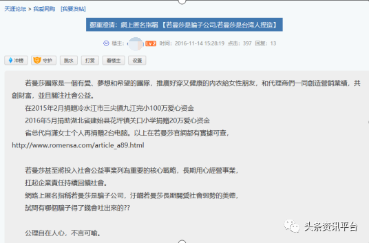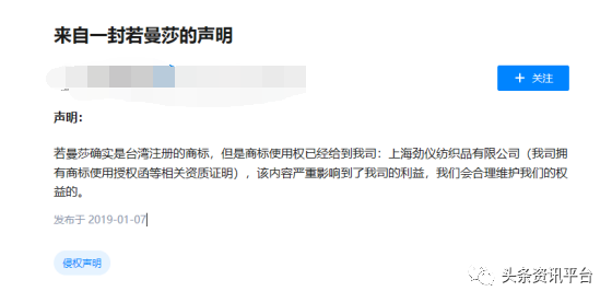 前段时间,针对这些反馈,在知乎和天涯社区上,先后流出了《来自一封若曼莎的声明》,针对上述内容表达质疑。该《声明》称,“若曼莎确实是台湾注册的商标,但是商标使用权已经给到我司:上海劲仪纺织品有限公司(我司拥有商标使用授权函等相关资质证明),该内容严重影响到了我司的利益,我们会合理维护我们的权益的。”