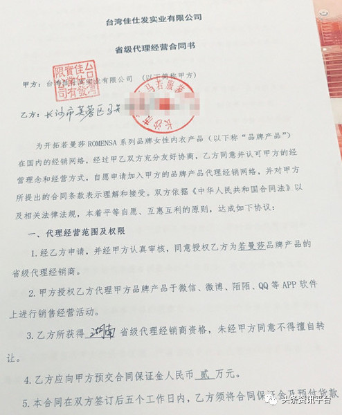 除了珍妮贝儿的商标问题,还有若曼莎的代理合同问题。在网上,之前也有一位省级代理晒出了自己与公司所签订的合同,反映签合同盖的章有问题:盖在合同上的印章公司名称是台湾佳仕发实业有限公司,但经查台湾经济部网站,全台湾只有一家佳仕发公司,即佳仕发实业有限公司, 而并非台湾佳仕发实业有限公司。