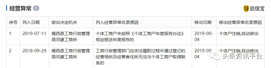 此外,在胡稳成名下,还有一家企业,名为“揭西县河婆稳成服装网店”,该公司在2018年和2019年连续两年被揭西县工商行政管理局河婆工商所列入经营异常名录,截止该公司注销之日,尚未被移除该名单。