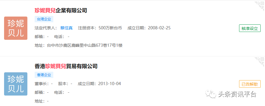 经查,珍妮贝儿企业有限公司于2008年2月在中国台湾省注册,代表人同样姓蔡,为蔡佳真。另外一家在中国香港注册的香港珍妮贝儿贸易有限公司在2013年1月注册,现已告解散。而至于这家公司为何解散、若曼莎网站上为何没有了珍妮贝儿的姓名,这或许和一份在2015年5月发表在《三湘都市报》上的声明有关。