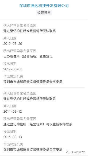 据天眼查资料显示,湖北耀你易企播科技有限公司对外投资的一家名为深圳市准达科技开发有限公司曾因为频繁地更换住所而被列入企业经营异常名单,并且目前该公司的网站无法进入。