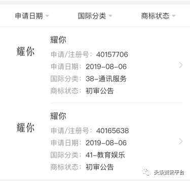 目前,据天眼查资料显示,公司的“耀你”商标还尚在初审阶段。