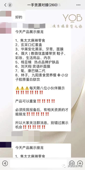 随后,笔者在进一步的调查当中,在耀你易企播的相关微信群里发现了“货源”的踪迹,不是大众耳熟能详的产品,也并没有详细的相关信息。