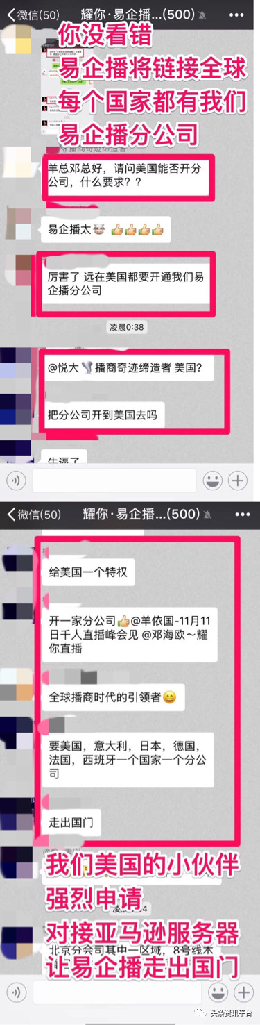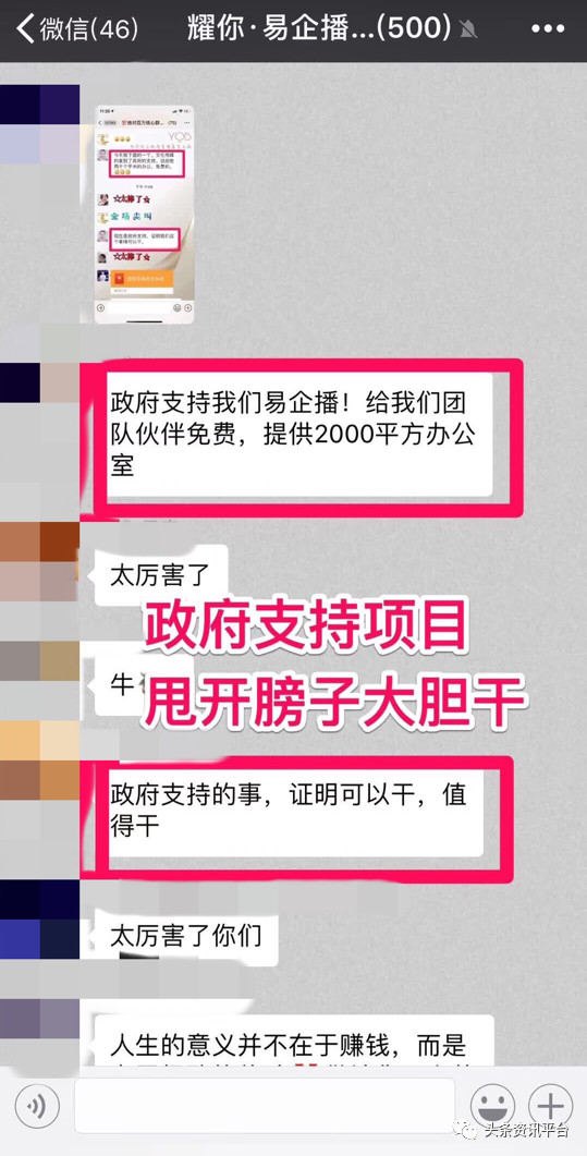 除此之外,笔者还发现了群里有人表示耀你易企播将链接全国,每个国家都将有耀你易企播的分公司,并且目前耀你易企播还得到了政府的支持,给团队伙伴免费提供了办公室,还提出了是政府支持的项目,要甩开膀子大胆干的号召。