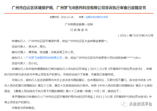 经查,广州梦飞诗医药科技有限公司成立于2014年2月18日,法定代表人刘小英,股东有刘小英、刘小纪(大股东)、欧家顺,注册资本100万元。关于这家公司,我们发现了一份《广州市白云区环境保护局、广州梦飞诗医药科技有限公司非诉执行审查行政裁定书》,梦飞诗医药公司曾遭到环保局的行政处罚,但拒不执行,后沦为被执行人,最终,广州铁路运输第一法院准予强制执行申请执行人广州市白云区环境保护局作出的云环保监[2015]511号《环境保护行政处罚决定书》中停止项目生产的部分。