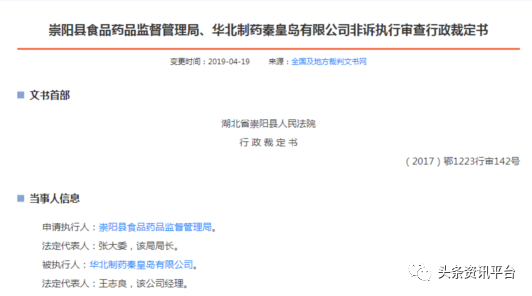 另据《崇阳县食品药品监督管理局、华北制药秦皇岛有限公司非诉执行审查行政裁定书》披露,被执行人华北制药秦皇岛有限公司于2016年4月与崇阳县个体工商户王某某签订《华北制药大健康产业中心战略合作伙伴经销合同书》,授权王某某在崇阳县销售产品。同年5月,华北制药秦皇岛有限公司向王某某销售“杞能量果汁饮料”,该食品的标签标注违反了《食品安全法》之规定,构成了经营标签不符合食品安全法规定的食品的行为。崇阳县食品药品监督管理局依据《食品安全法》作出:罚款28000元的行政处罚。湖北省崇阳县人民法院也最终判定,对申请执行人崇阳县食品药品监督管理局于2016年10月作出的鄂崇食药监食罚(2016)324号行政处罚决定准予执行。