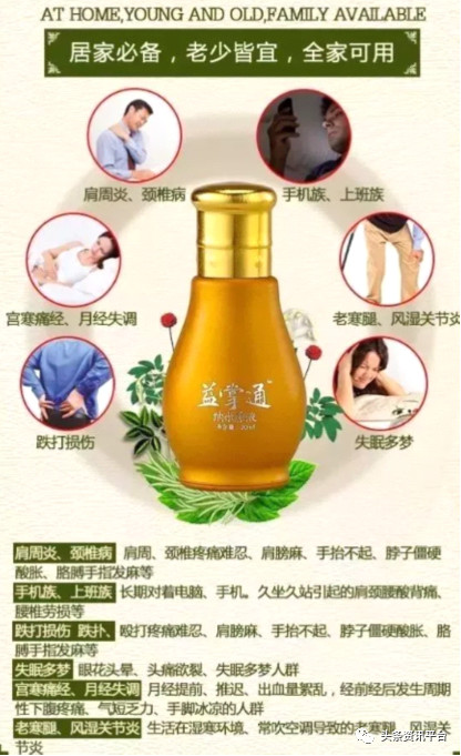 根据经销商宣传资料介绍,益掌通是一款通过纯中草药纳米技术制成的溶液(外用药),于2017年5月6日上市。此产品主要调理病症包括老寒腿、腰肌劳损、强制性脊柱炎、牙痛、神经性偏头痛等几十种病症。