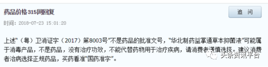 对此,药品价格315网的答复也无外其中:“华北制药益掌通草本抑菌液”可能属于消毒产品,不是药品,没有治疗功效,不能代替药物用于治疗疾病,请消费者谨慎选择。建议消费者治病选择正规药品,买药看准“国药准字”。