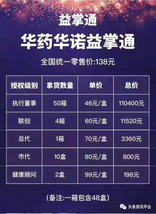 据益掌通代理商李先生介绍,此产品零售价为一盒138元;购买两盒可成为健康顾问,只需198元即可授权代理;市代门槛是限时活动800元10盒,一盒80元;总代则限时3360元,拿货数量为一箱(48盒),一盒70元;联合创始人限时门槛为11520元,拿货四箱,一盒60元;执行董事的门槛则为110400元,拿货50箱,一盒46元。