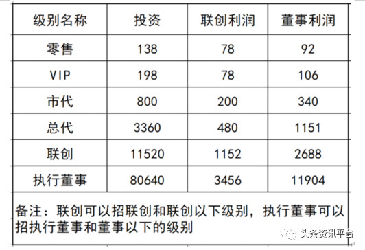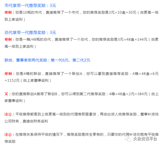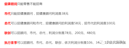 除了赚差价外,代理商们在此代理制度中还有推荐奖可拿:VIP(健康顾问)只能零售;市代只能招VIP,招VIP利润是38元;总代只能招VIP和市代,招VIP的利润是58元,招市代的利润是100元;联创可以招VIP、市代、总代,招VIP的利润是78元,招市代的利润是200元,招总代的利润是480元;联创可以招联创,享受永久的奖金,举个例子来看,A是联创,A招了一个联创B,对于B补货的每一盒,A都能享受到6元的奖金。B推荐联创C,A的隔代联创C补货,A还可以享受到2元一盒的奖金。实际数字是:比如A是联创,A招一个联创,第一次的收入是1152元,后期补货,终身都有奖金。