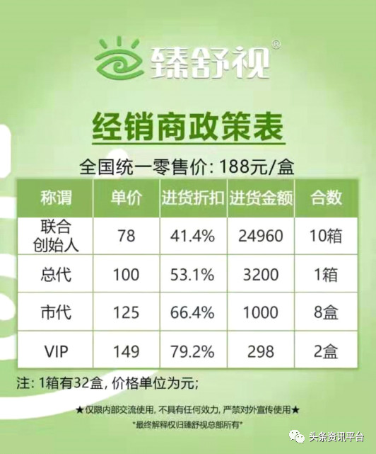 如今,在益掌通团队成员们的手中,现在又多了一款名为“臻舒视”的产品,据了解,臻舒视一盒是188元,两盒是298元,是南京同仁堂生产的产品,其模式和益掌通类似,不同之处在于平级推荐是第1代7元一盒,第2代4元一盒。相较而言,此产品的返利更多,利润更高。