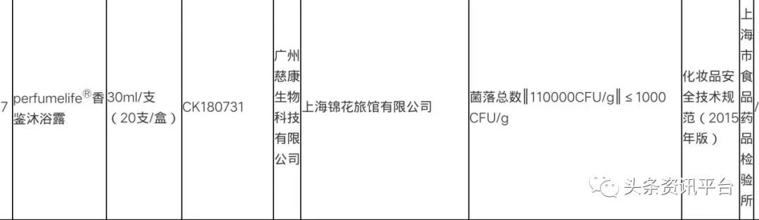 其中,就包括上海锦花旅馆有限公司被抽检的“香鉴(perfumelife)”沐浴露(30毫升/支,20支/盒,批号:CK180731,广州慈康生物科技有限公司生产),菌落总数高达11万CFU/克,足足超出标准规定限值(1000CFU/克)的109倍。