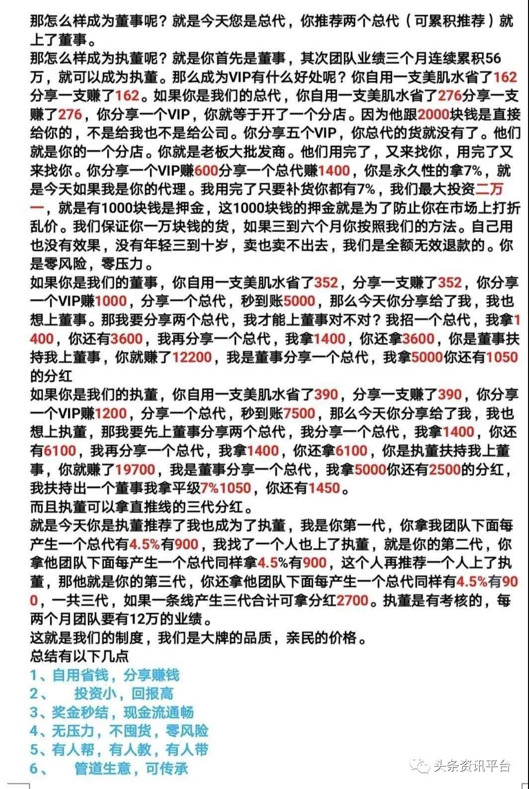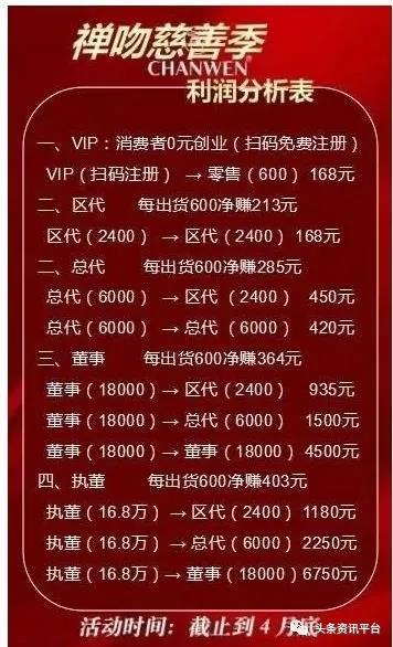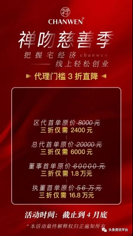除了VIP会员之外,还有四个等级的代理,分别是区代、总代、董事、执董。眼下因为疫情的原因,该公司开展了一个“代理门槛3折直降”的活动,只需要2400元就能够成为原门槛为8000元的区代,只需要6000元就能够成为原门槛为2万元的总代,只需要1.8万元就能够成为原门槛为6万元的董事,只需要16.8万元就能够成为原门槛为56万元的执董。